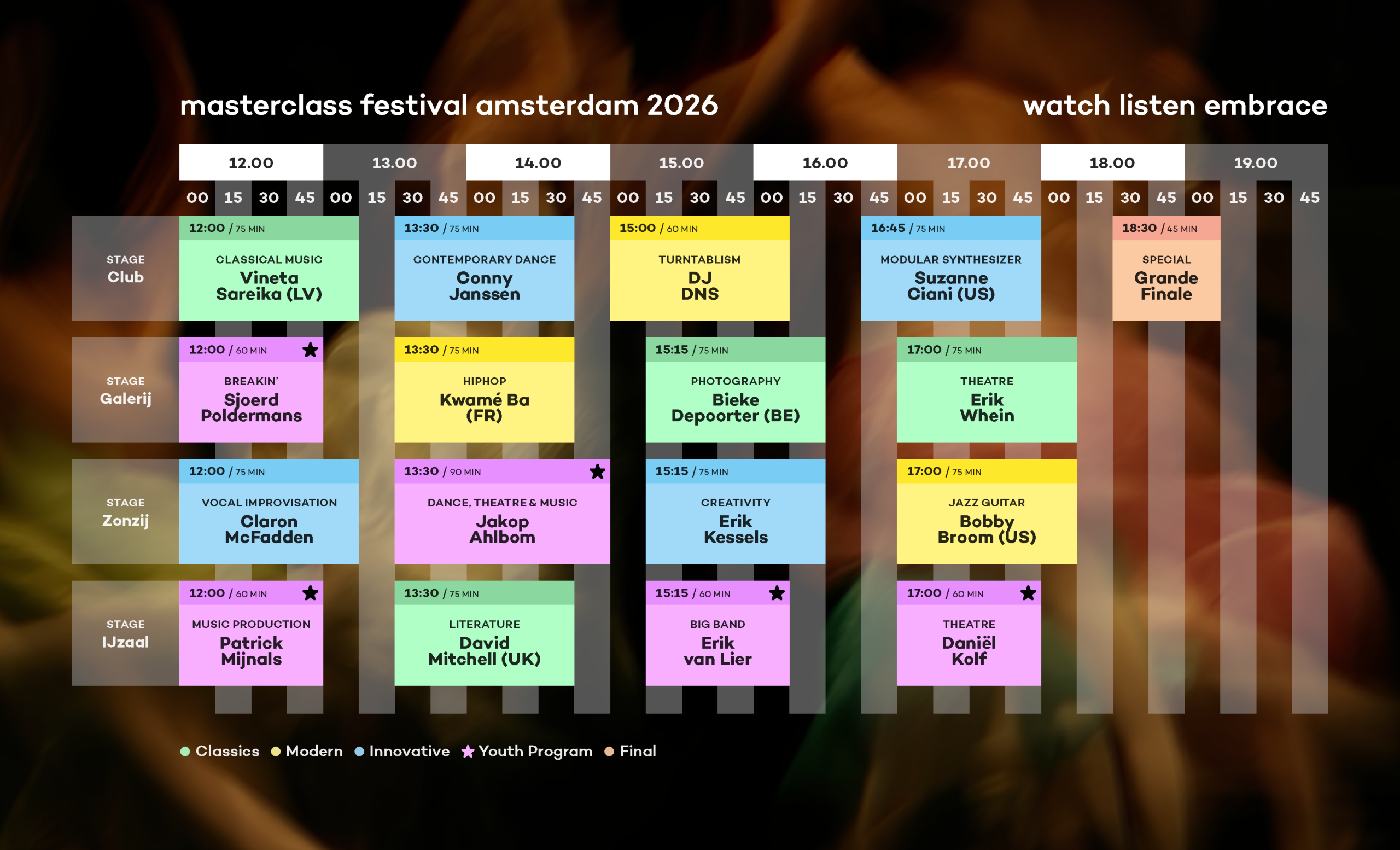 In zestien unieke masterclasses en de Grande Finale delen zij hun kennis en vakmanschap met toptalenten.Ontdek hoe kunst ontstaat, van streetdance, jazz en mode tot klassieke muziek, theater en ballet. Zo dichtbij het maakproces kom je nergens anders.